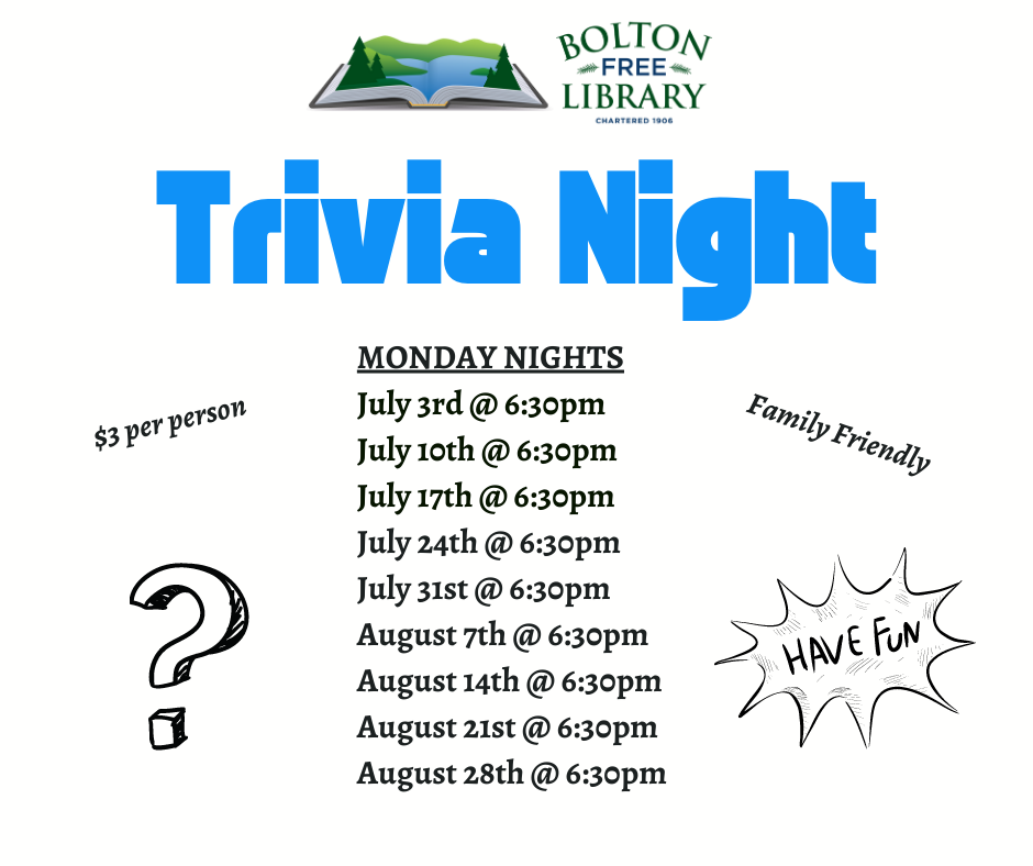 Bolton Free Library 4922 Lakeshore Dr., Bolton Landing, NY, United StatesJoin us for a family friendly evening of trivia!