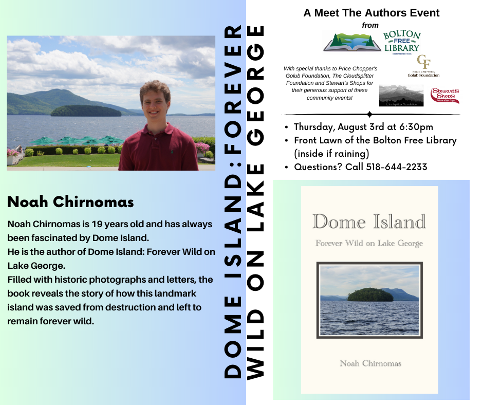 Bolton Free Library 4922 Lakeshore Dr., Bolton Landing, NY, United StatesCome to the Library and meet author Noah Chirnomas! Noah Chirnomas is 19 years old and has always been fascinated by Dome Island. He is the author of Dome Island:...