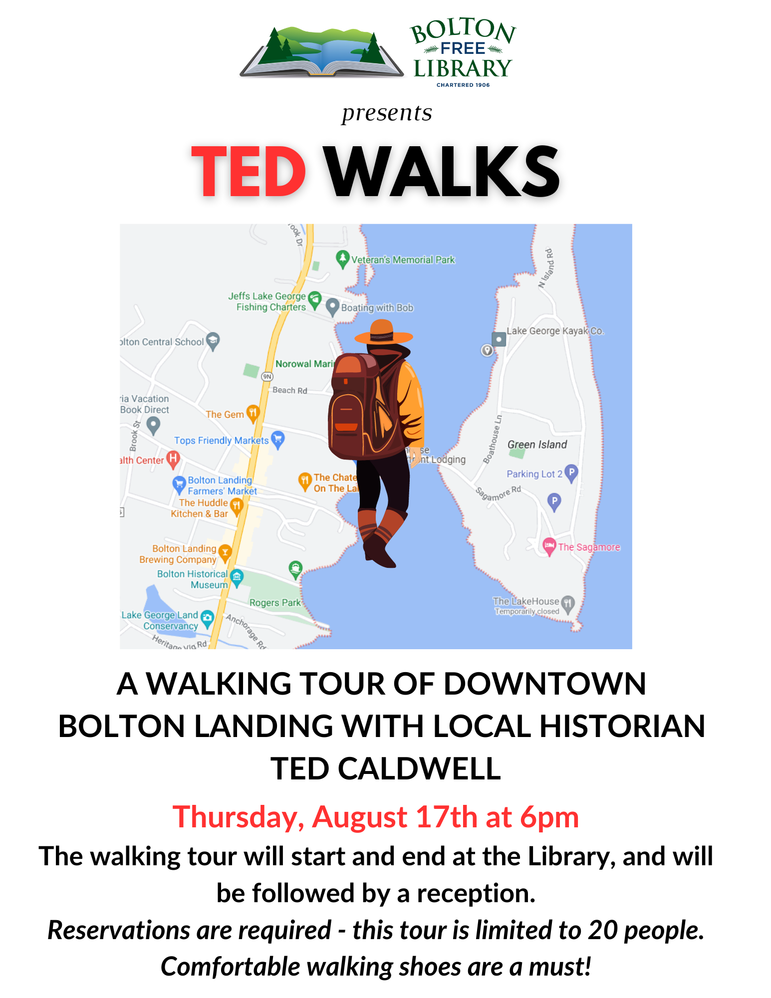 Bolton Free Library 4922 Lakeshore Dr., Bolton Landing, NY, United StatesJoin us on Thursday, August 17th for a walking history tour of downtown Bolton Landing with local historian Ted Caldwell. The Tour will start and end at the Bolton Free...
