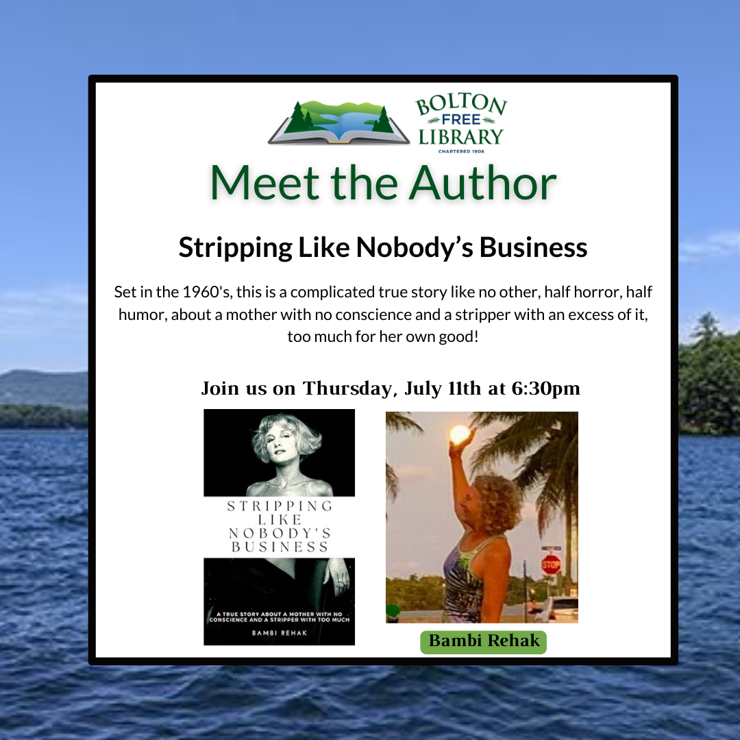 Bolton Free Library 4922 Lakeshore Dr., Bolton Landing, NY, United StatesSet in the 1960's, this is a complicated true story like no other, half horror, half humor, about a mother with no conscience and a stripper with an excess of...