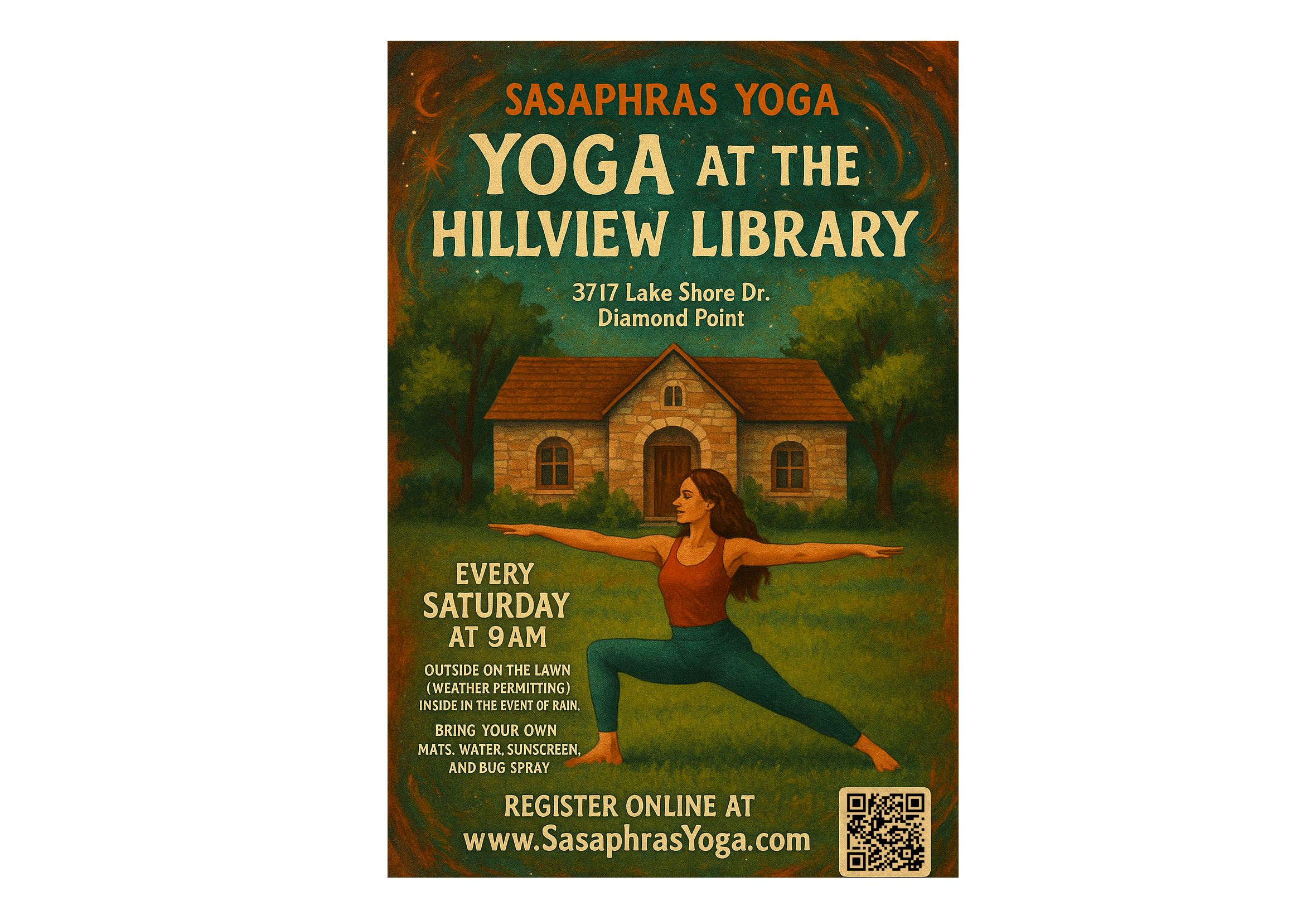Hillview Free Library 3717 Lakeshore Dr, Diamond Point, NY, United StatesJoin Stephanie for a thoughtfully curated outdoor Saturday Flow with essential oils, poses and sounds to create an atmosphere and experience for all levels! $15.00. Bring your own mat. Blocks...